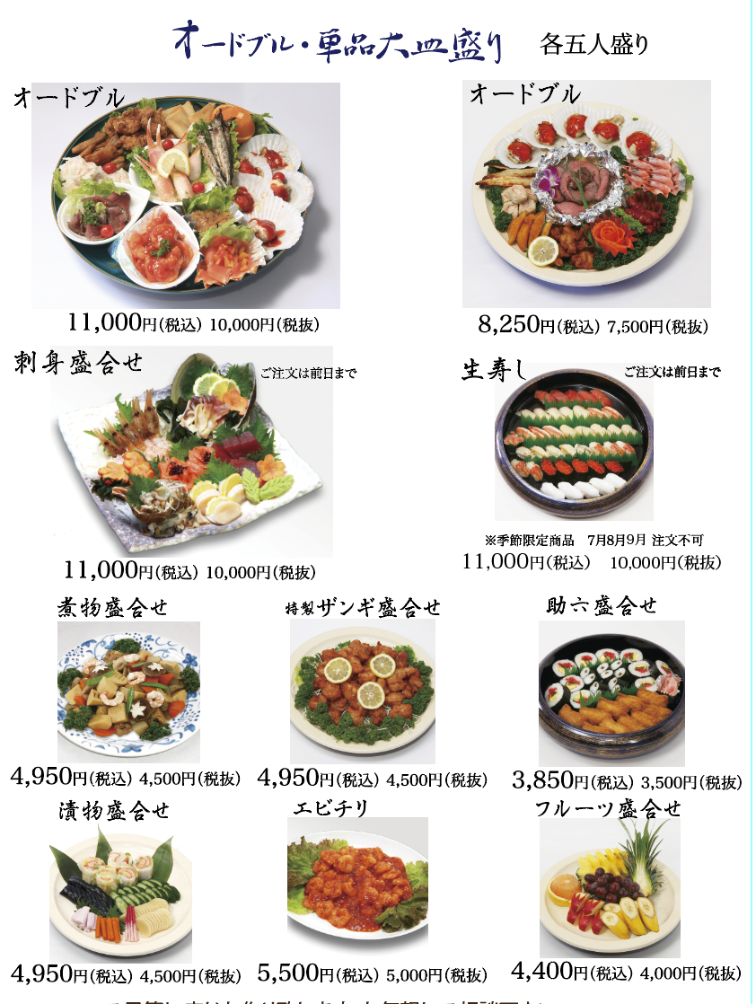 オードブル・お刺身盛り合わせ・ザンギ盛り合わせ・助六盛り合わせ・フルーツ盛合わせ